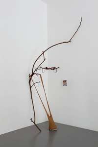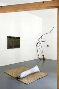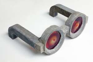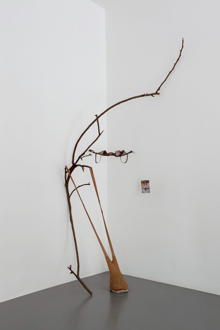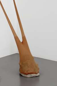From Daniel Sinsel who increases and distorts the dimensions and formal qualities of a pair of round glasses combining the weight and the superficial roughness of the concrete with glass recalling bottle bottoms; to Oscar Tuazon that works on the basic essentiality of wood and concrete, building constructions that come across as weight-bearing structures suspended between solidity and frailty; to Michael Deanʼs sculptures which look like archaic monoliths containing hidden indecipherable signs and languages, elaboration of short written texts which letters get melted in the shapes and volumes of the object itself.