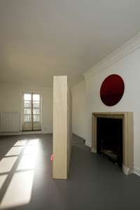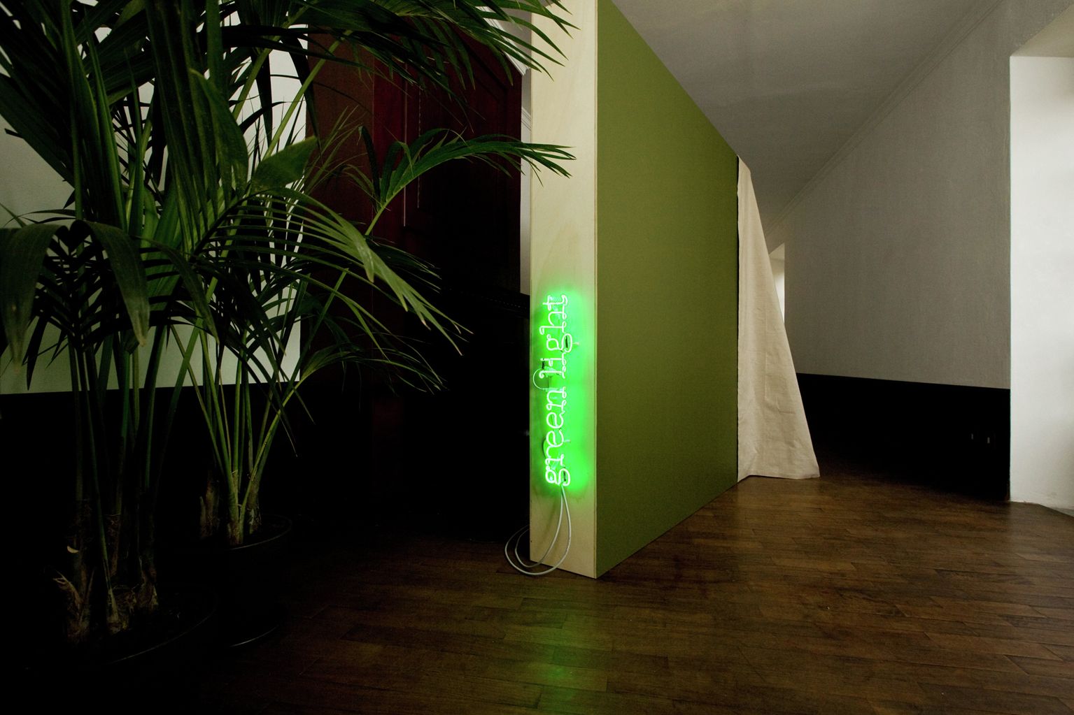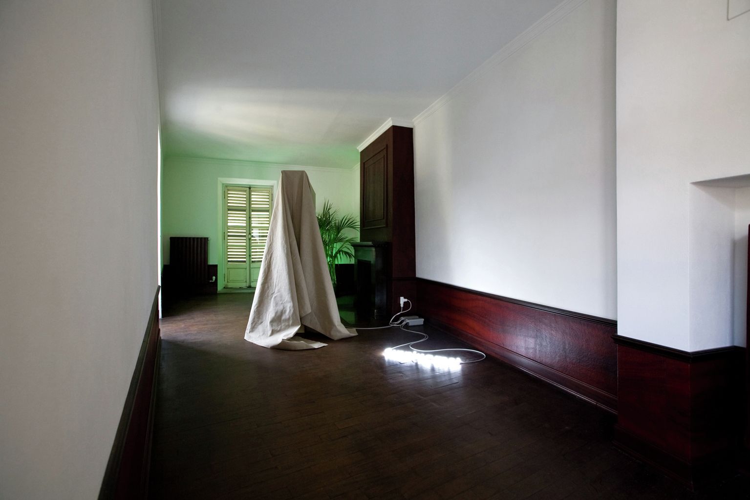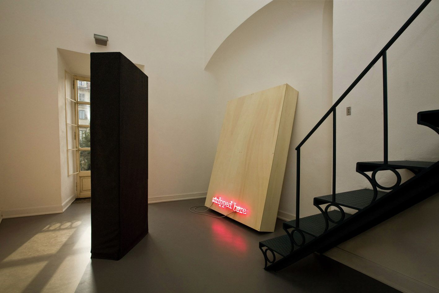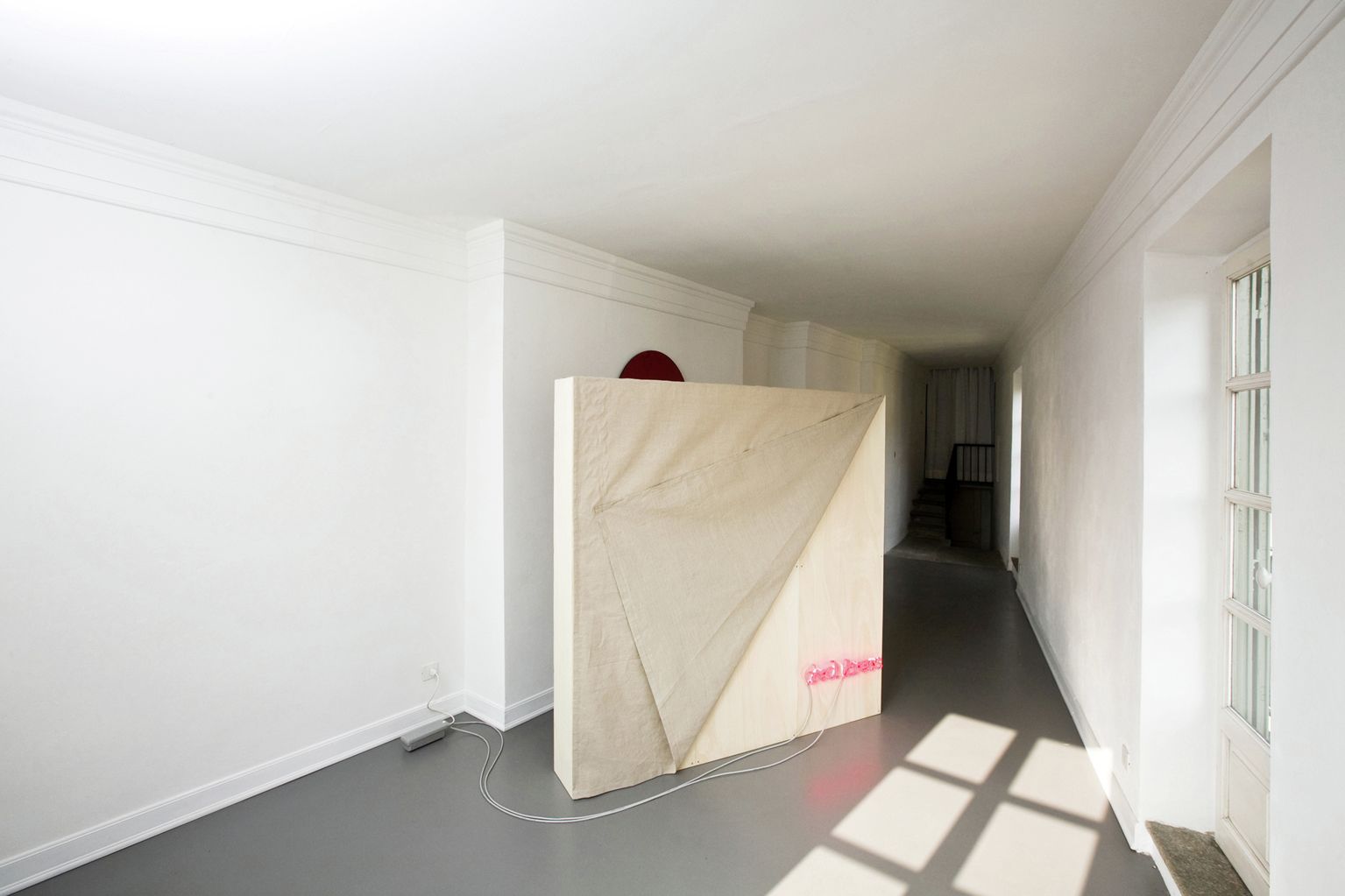 Le opere sono realizzate con materiali come compensato non trattato, tela grezza, tessuti e oggetti trovati, scelti pensando agli elementi architettonici delle stanze.