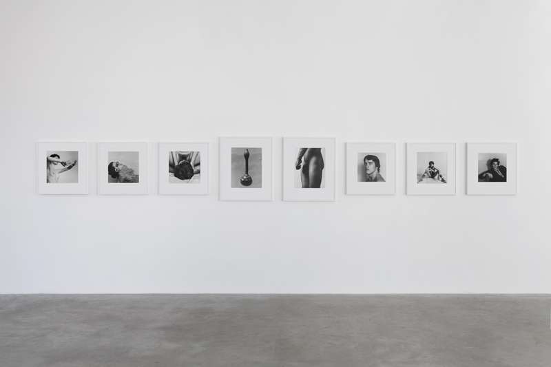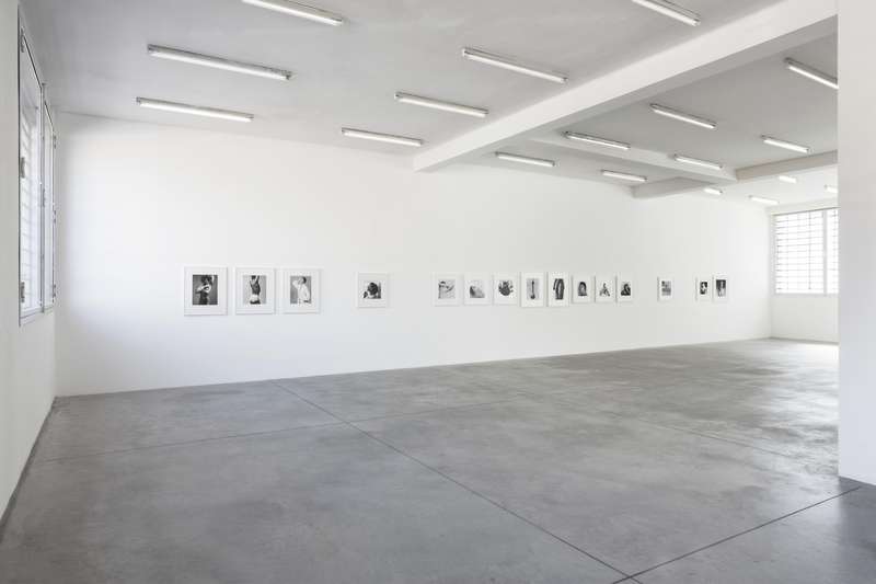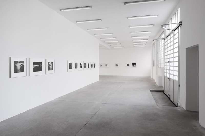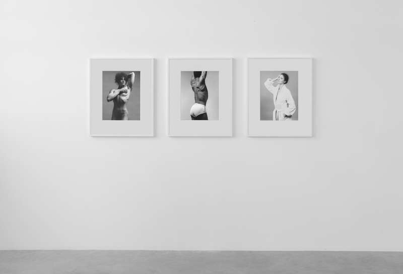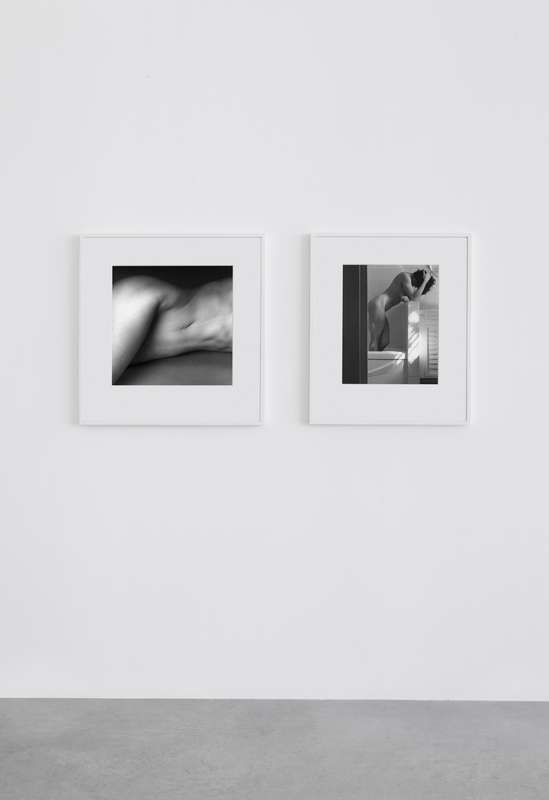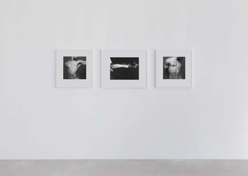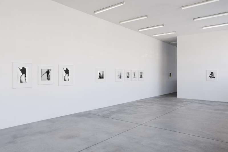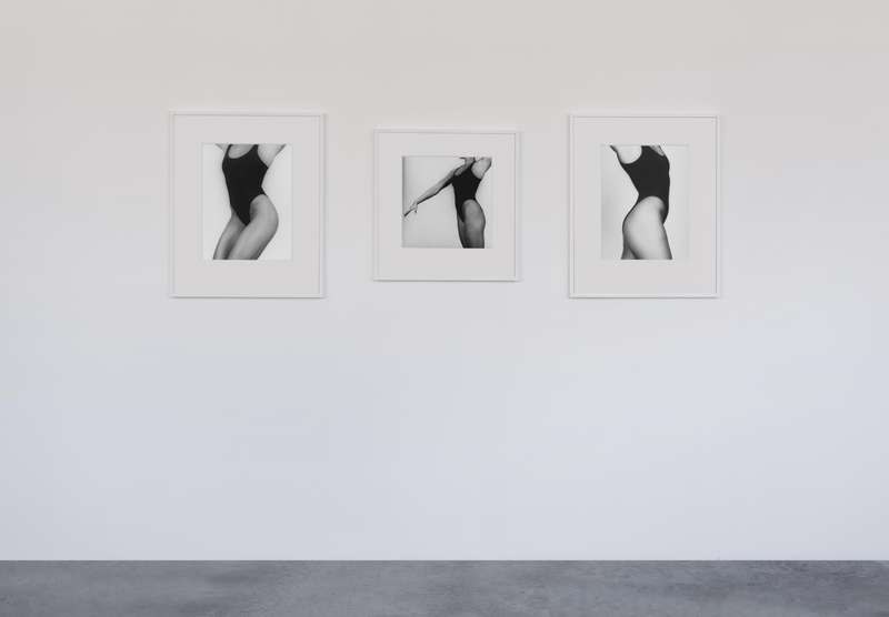 Per contrasto a seguire, delle immagini degli anni ’80 completamente costruite in studio, corpi femminili senza testa sospesi su un fondo bianco uniforme, i contorni morbidi e soffusi, nell’esaltazione edonistica della perfezione e della cura del corpo tipica di quegli anni, nel culto della palestra non come luogo in cui si formano gli atleti ma in cui invece si scolpiscono i muscoli. Una lunga sequenza modulata di opere giocate sulla gamma dei grigi, meno contrastata, permette di spaziare in molte delle direzioni di ricerca dell’artista: sensualità, sesso, movimento, torsione, ieraticità nella posa e ricerca di espressività.