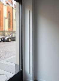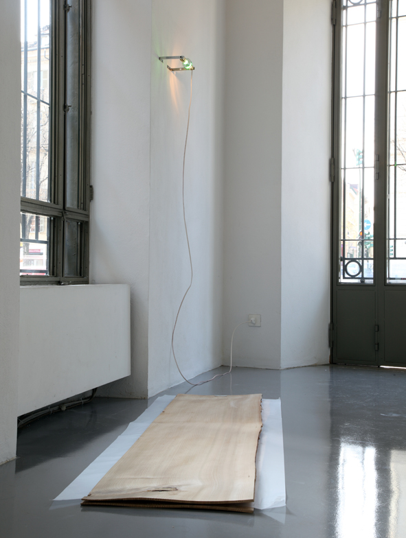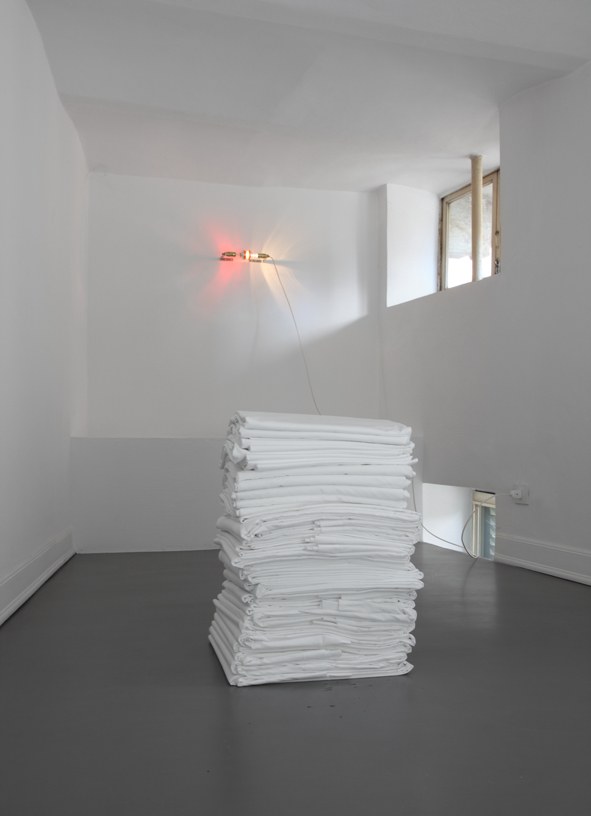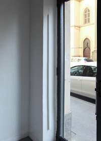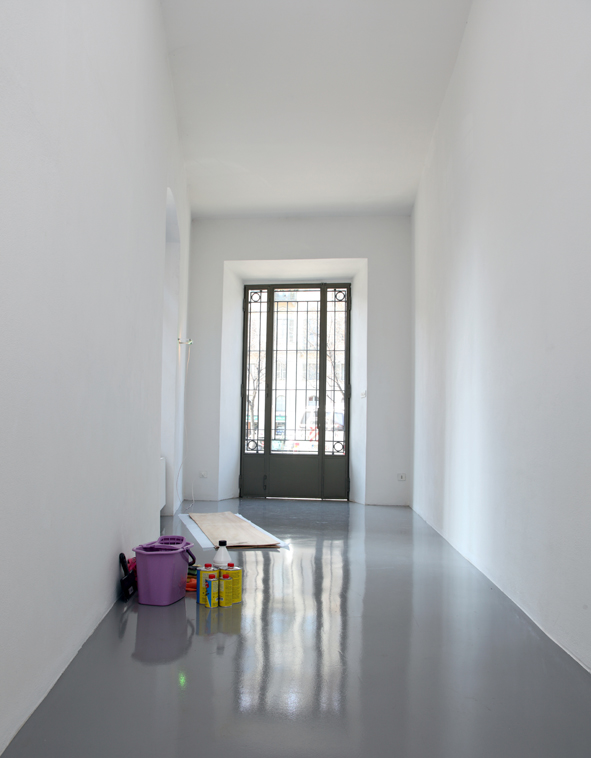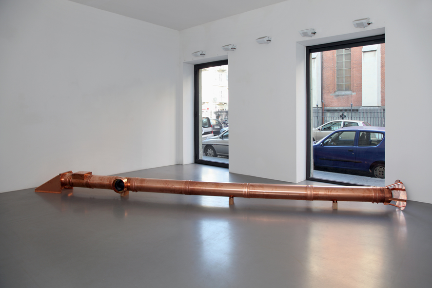 Nel ProjectSpace di Piazza Santa Giulia 0/F le coordinate spaziali legate a un oggetto sono modificate dall'artista per invertirne il significato e utilizzo, modificandone di conseguenza il potenziale narrativo: North si compone di una canna fumaria in rame presentata sul pavimento dello spazio, la cui estremità è rivolta verso il punto cardinale a cui il titolo fa riferimento. Ciò che prima si rivolgeva al cielo ora indica una direzione precisa: un suggerimento a un suo ideale nuovo uso e alla possibilità che nuove storie entrino in contatto con esso. Nello spazio SiteSpecific una coppia di lunghe candele realizzate dallʼartista inquadra la cornice visiva della vetrata dʼingresso, rendendo il luogo inaccessibile e caricandolo di quella varietà di significati che le candele suggeriscono tradizionalmente, insieme alle suggestioni generate dal nuovo contesto in cui sono presentate.